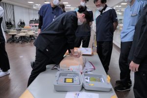 実技では、正しい胸骨圧迫を行うと想像以上に体力を消耗するため、長期化すると人手が必要であることから、スタッフ同士の連携をイメージして実技を行いました。