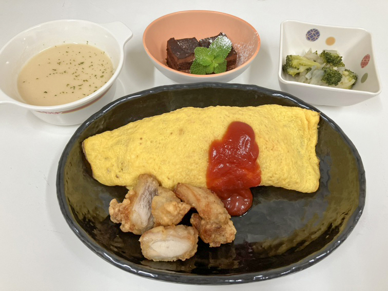 患者様は黙々とオムライスを食べている姿が印象的でした。「オムライスのボリュームがあって食べられるか心配していたけれど、案外ペロっと食べられたわ」「唐揚げがついていて豪勢でした!」「チョコレートケーキがおいしかったです!」とお言葉をいただきました。