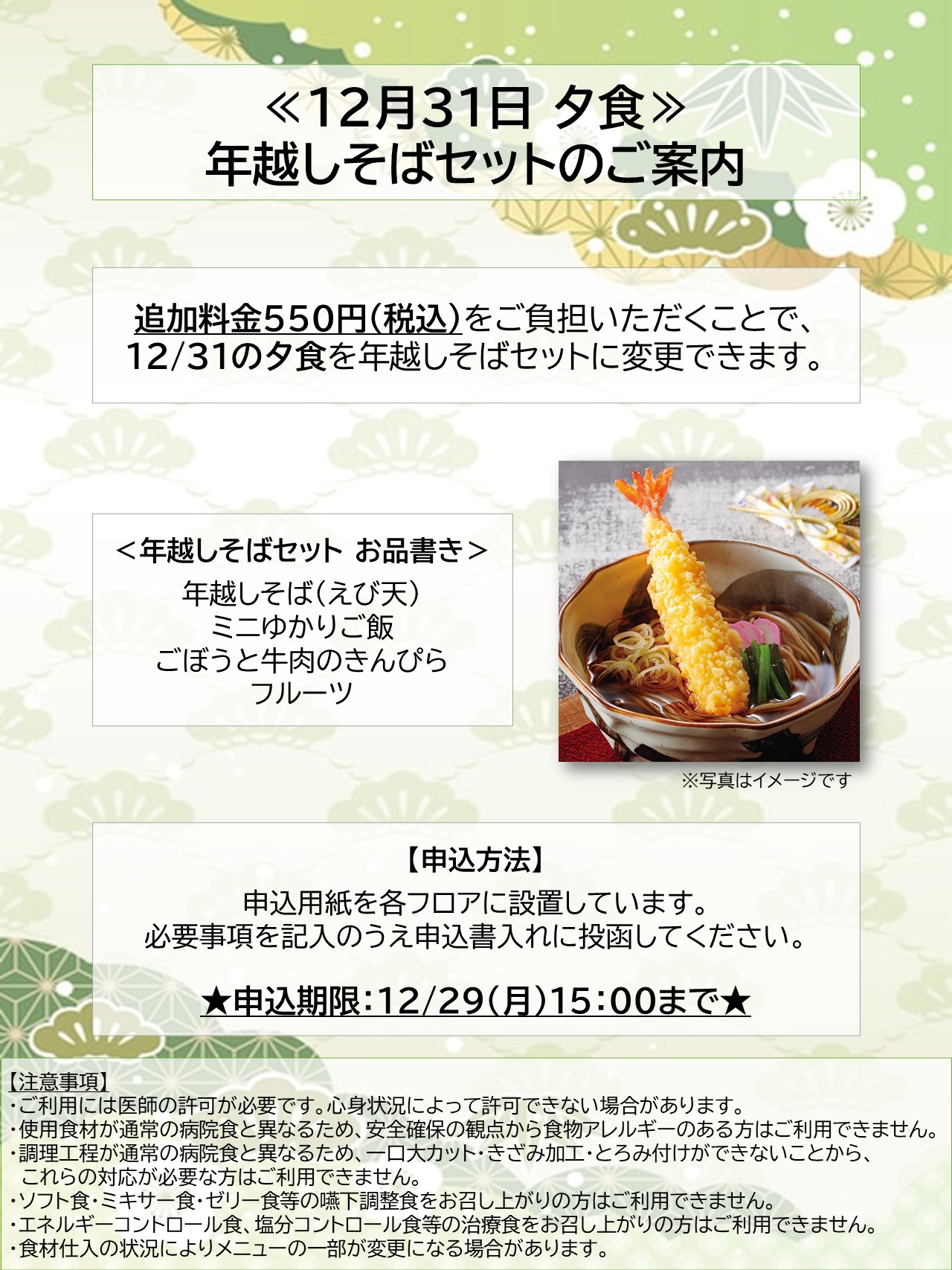 今回、入院中のお食事を少しでも楽しんでいただけるよう「年越しそば」をご用意いたしました。